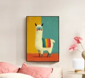 Un lama bianco con orecchie e naso neri poggia su una base strutturata di colore arancione. Indossa una sciarpa a righe colorate in rosso, arancione, giallo e turchese. Gli occhi chiusi, leggermente sorridenti, su uno sfondo giallo-turchese diviso: allegro e affascinante.