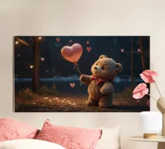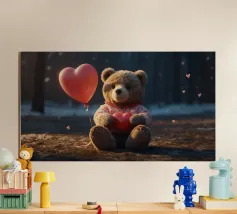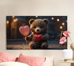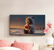 Un simpatico orsacchiotto vestito con un'accogliente felpa con cappuccio siede nella neve, tenendo gioiosamente un cuore rosso mentre un palloncino si muove nell'aria fresca della sera sotto un tramonto colorato.