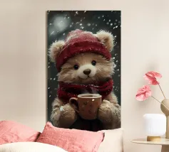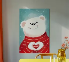 Un orsacchiotto con un'accogliente felpa con cappuccio stringe un cuore in una terra invernale plexiglass