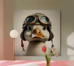 Un piccolo anatroccolo nuota giocosamente nell'acqua calma, indossando un vivace cappello viola. Lo sfondo è morbido e sognante, creando un'atmosfera stravagante intorno all'allegra scena.