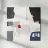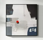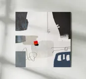 Composizione astratta con varie forme e linee geometriche. In particolare, un rettangolo blu con quadrati bianchi si trova vicino a una forma grigia traslucida accentuata di rosso. Una forma blu scuro dalla texture ruvida occupa la parte superiore sinistra. Lo sfondo è bianco sporco con sottili texture grigie.