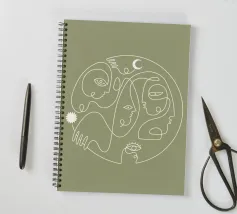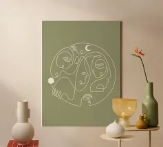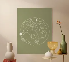 "Universal Self" è un'accattivante opera d'arte lineare verde oliva che presenta volti interconnessi disposti in forma circolare, a simboleggiare l'unità e l'esperienza umana collettiva. Il cerchio è completato dal sole e dalla luna, che rappresentano l'equilibrio, il tempo e l'eterno ciclo della vita. Il design minimalista, combinato con l'armoniosa miscela di elementi celesti, crea un senso di universalità e unicità, rendendo quest'opera d'arte stimolante e visivamente affascinante.