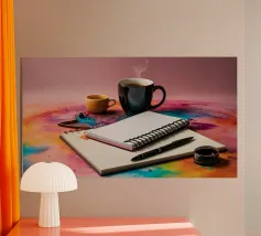 Uno spazio di lavoro colorato con un taccuino con un fiore plexiglass