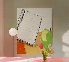 Un vivace spazio di lavoro mostra un quaderno a righe ornato da un fiore rosa, circondato da carte colorate e materiale artistico, che invita alla creatività e all'ispirazione.