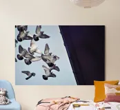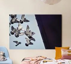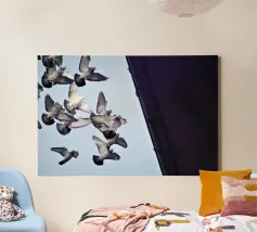 Un'improvvisa e gioiosa esplosione di ali contro il cielo della città. Questa fotografia dinamica blocca uno stormo di uccelli in un momento di pura e sfrenata libertà. Contro le linee architettoniche del paesaggio urbano, la loro ascesa è un potente simbolo di liberazione e di spirito selvaggio. Un singolo uccello bianco brilla tra lo stormo, un faro di pace e speranza. Una celebrazione dei momenti belli e indomiti che esistono intorno a noi, quest'opera porta un senso di energia, vita e possibilità di crescita su qualsiasi parete.