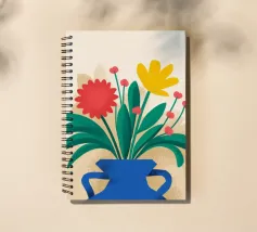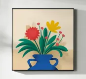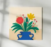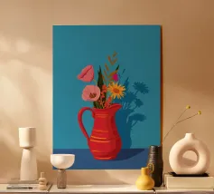 Un vaso blu brillante a due manici contiene una semplice composizione di fiori rossi e gialli con foglie verdi, su uno sfondo beige neutro.