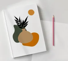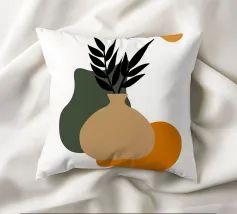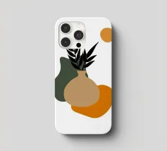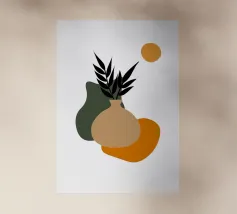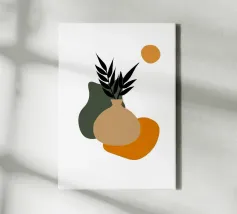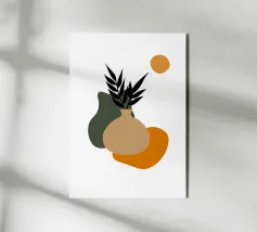 vaso foglie pianta forma arancione vaso marrone forma verde elementi astratti cerchio forme semplici fogliame botanico decorativo pianta da interno toni della terra design minimalista arredamento per la casa natura composizione contrasto forme organiche