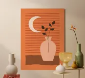 vaso luna crescente foglie sfondo a righe linee composizione minimalista ambientazione still-life toni neutri tavolozza terrosa design semplicistico forme geometriche arredamento d'interni arredamento per la casa stampa d'arte arredamento moderno elementi naturali botanico fogliame steli di piante scenario serale