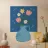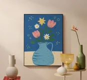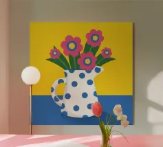 Un semplice vaso blu racchiude un delicato bouquet di fiori stilizzati rosa e bianchi con stelle gialle, su uno sfondo blu intenso e strutturato, creando una natura morta affascinante e serena.