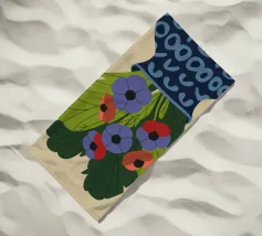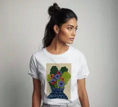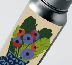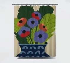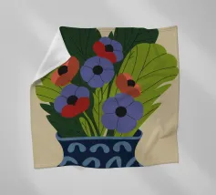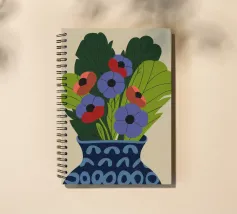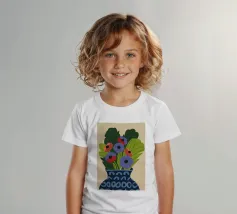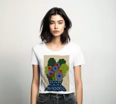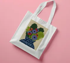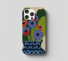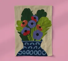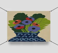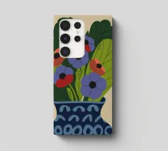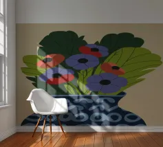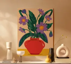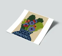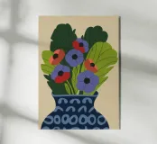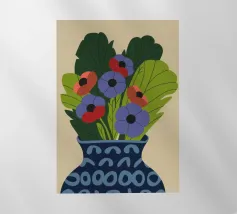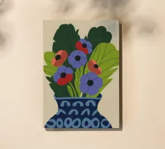 Un dipinto raffigurante un vaso blu con un motivo bianco, riempito con grandi foglie verdi e fiori colorati, tra cui fiori rossi, viola e arancioni.