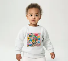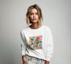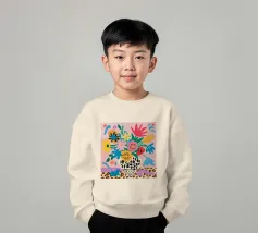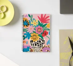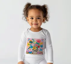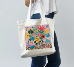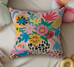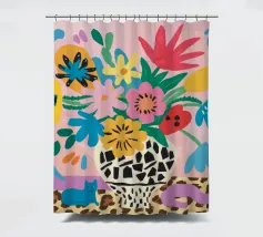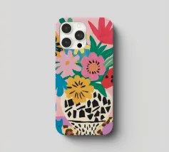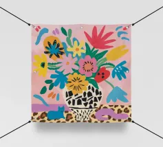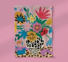 Una natura morta massimalista e gioiosa che presenta un bouquet di fiori selvatici, con un vaso in stampa leopardo e un altro in stampa mucca. La composizione è una divertente, caotica e vibrante celebrazione di motivi e colori.