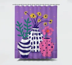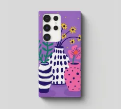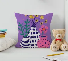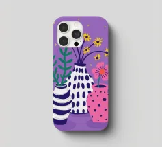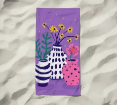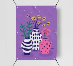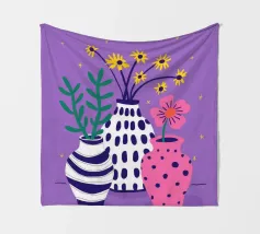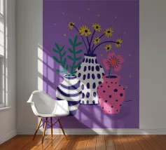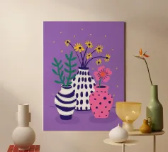 Three distinct vases one striped, one pink with polka dots, and one plain hold small wildflower bouquets against a speckled purple background, creating a playful scene.
