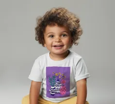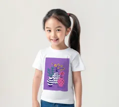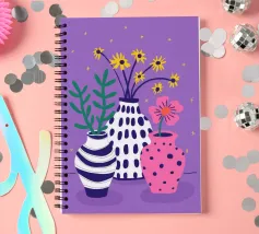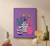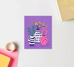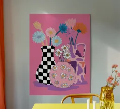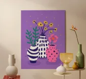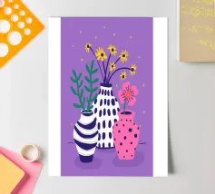 Tre vasi distinti, uno a righe, uno rosa a pois e uno a tinta unita, ospitano piccoli bouquet di fiori di campo su uno sfondo viola maculato, creando una scena giocosa.