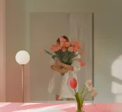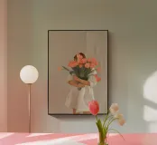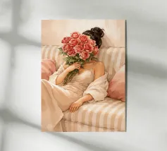 Un dipinto morbido ed elegante che cattura la tranquilla bellezza di un gesto semplice. Una donna, vestita con un fluente abito bianco, abbraccia un grande bouquet di tulipani rosa corallo - il suo volto è nascosto dietro i fiori, lasciando che siano i fiori a parlare. Lo sfondo beige tenue e la texture pittorica esaltano l'atmosfera delicata e intima. Minimalista ed emotivo, questo pezzo evoca i temi della gratitudine, della femminilità e della poesia dei momenti quotidiani, rendendolo un pezzo senza tempo per gli interni che tendono verso gli stili romantico, moderno o scandinavo.