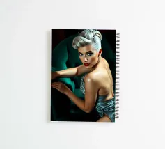 Modello Pin-Up sensuale in chaise longue di velluto color smeraldo Un ritratto seducente e ad alto contrasto di una modella pin-up biondo platino sdraiata su una lussuosa chaise lounge di velluto verde smeraldo, che indossa un abito argentato scintillante ed emana un fascino sicuro e civettuolo.