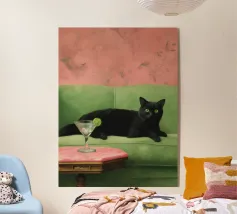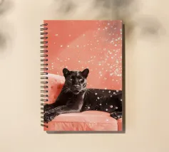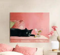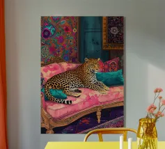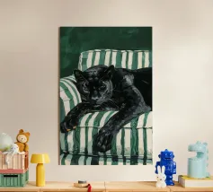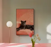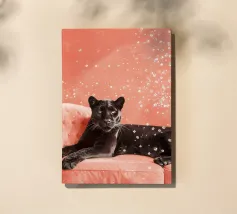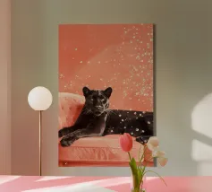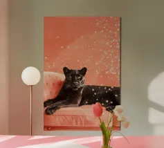 Adagiata senza sforzo su un morbido sfondo color pesca, questa pantera nera irradia una tranquilla sicurezza e una sobria eleganza. Il contrasto tra l'oscurità profonda e vellutata della pelliccia della pantera e i toni caldi e tenui dell'ambientazione crea un'atmosfera da sogno, intima e potente al tempo stesso.
