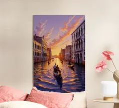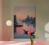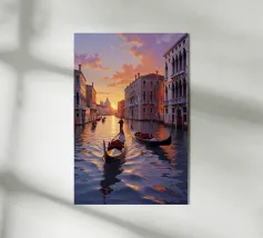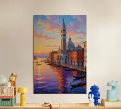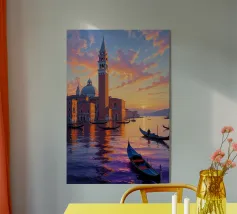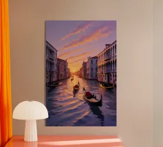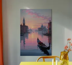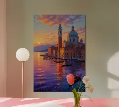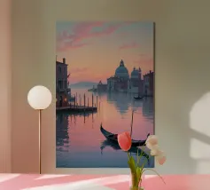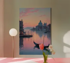 Una gondola scivola pigramente lungo la Laguna di Venezia, incorniciata da edifici secolari che risplendono nelle tonalità dorate del tramonto. Il delicato cielo rosa sfuma nell'acqua scintillante, creando una danza ipnotica di luci e riflessi. In lontananza, le cupole di Santa Maria della Salute si ergono alte, a testimonianza del ricco patrimonio culturale di Venezia. Questo dipinto a olio mozzafiato racchiude perfettamente l'eleganza senza tempo e il fascino romantico della città.