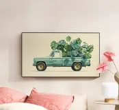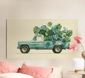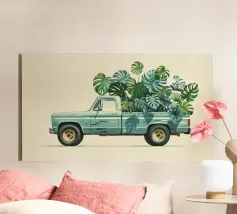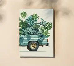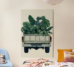 Quest'opera d'arte fonde il minimalismo moderno con l'abbondanza organica, presentando un dialogo tranquillo tra industria e natura. Il camioncino semplificato, reso in toni morbidi e tenui, diventa un contenitore per le lussureggianti foglie di monstera che traboccano dai suoi confini. Le linee pulite e la composizione equilibrata contrastano con la complessità ritmica del fogliame, suggerendo movimento, crescita e gentile coesistenza. L'opera è calma ma decisa, e trasforma un oggetto quotidiano in un vettore poetico di vita, consistenza e sottile narrazione attraverso la sola forma e il colore.