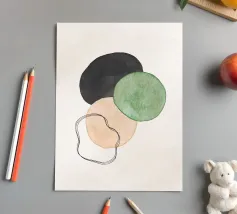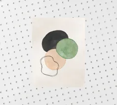Aggiungete un tocco di fascino minimalista al vostro spazio con questa vibrante stampa d'arte astratta moderna di metà secolo, caratterizzata da un'ipnotica miscela di forme geometriche e fluide di acquerello su uno sfondo neutro morbido e cremoso. Con la sua calda atmosfera scandinavo-giapponese, non è solo arte: è un'atmosfera.