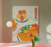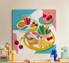 Questo disegno è una rappresentazione visiva della salute, della vitalità e dell'abbondanza della natura. I colori vivaci e le forme organiche di frutta e verdura simboleggiano nutrizione, energia e vita sana.