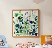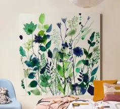 Una lussureggiante composizione ad acquerello di verdi selvatici e fiori colorati, che unisce smeraldo vibrante, indaco profondo e cobalto freddo. Questo studio botanico espressivo cattura l'energia del fogliame selvaggio, perfetto per aggiungere freschezza e contrasto a uno spazio.
