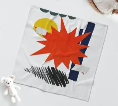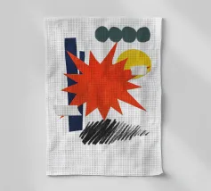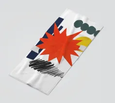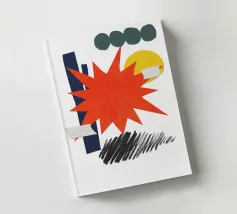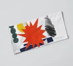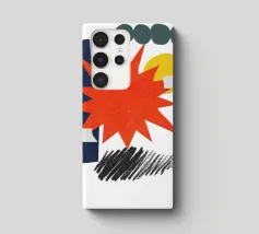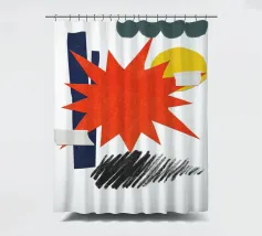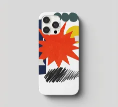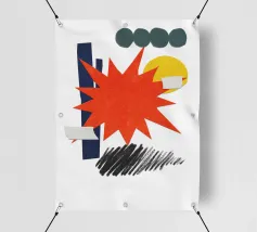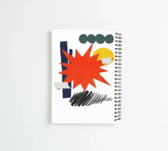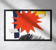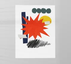 Un collage vivace presenta una forma a stella arancione, con elementi geometrici sovrapposti come cerchi e rettangoli in verde, giallo e blu. Gli scarabocchi neri aggiungono contrasto alla composizione colorata.