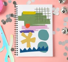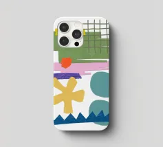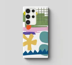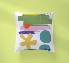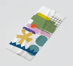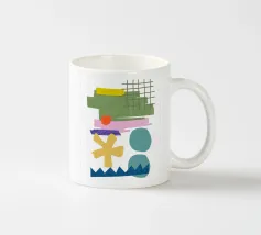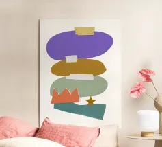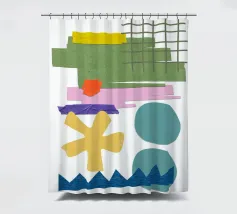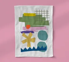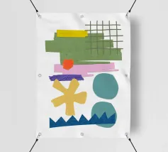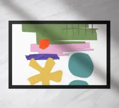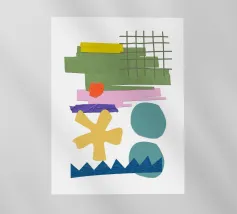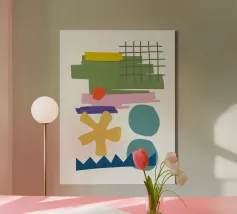 Una composizione vivace presenta varie forme geometriche in colori contrastanti, tra cui una griglia verde, rettangoli viola e rosa e cerchi blu. La composizione presenta forme astratte e giocose, come un asterisco giallo e una linea blu frastagliata, su uno sfondo bianco.