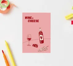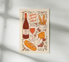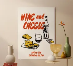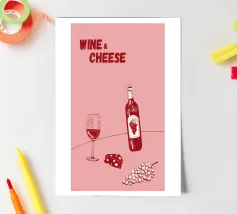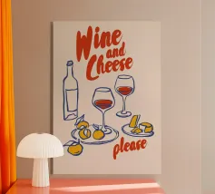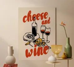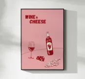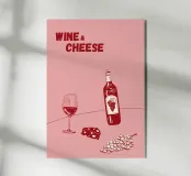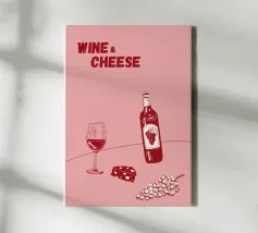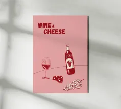 Poster "Vino e formaggio"! Un'illustrazione classica e minimalista nei ricchi toni del bordeaux e del rosso, con una bottiglia di vino rosso, un bicchiere pieno, uno spicchio di formaggio e un grappolo d'uva. Questo elegante disegno è perfetto per aggiungere un tocco di raffinatezza e fascino gastronomico alla cucina, alla sala da pranzo o al bar. L'estetica monocromatica rossa è chic e moderna. Un'opera d'arte da parete ideale per chi apprezza il vino e il divertimento! Vino, Formaggio, Vino rosso, Uva, Arredo cucina, Sala da pranzo, Carrello bar, Food art, minimalista, line art, rosso, bordeaux, sofisticato, divertente, illu