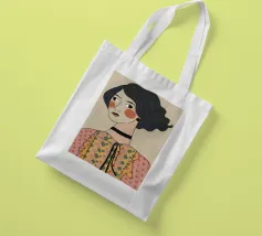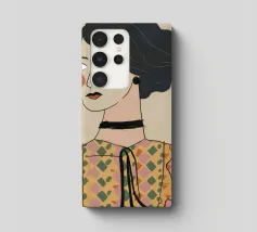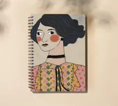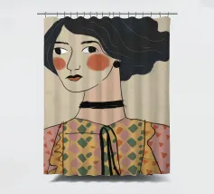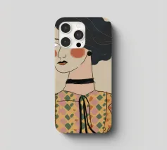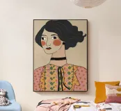 This painting features a person with short dark hair wearing a vintage-style dress with a geometric pattern in shades of pink, beige, and green. The person has a black choker around the neck. The background is a plain light beige color.