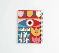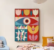 Una composizione surreale e artistica combina un occhio stilizzato con motivi geometrici e un fiore che sboccia, creando un pezzo misterioso e stimolante.