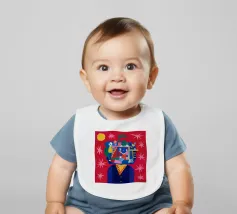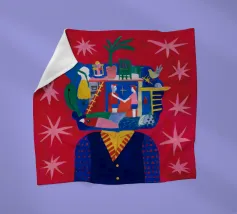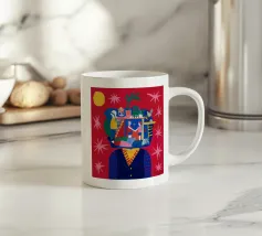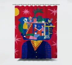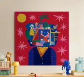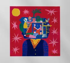 This painting depicts a head filled with various scenes including people, animals, and structures. The background is red with stars and a yellow sun.