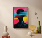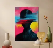 Un ritratto scuro e senza volto emerge da uno sfondo di colori vivaci. Gli occhi sono oscurati da un espressivo movimento di strofinamento di blu e rosso, come se la percezione fosse distorta o interrotta. Il quadro simboleggia la mancanza di chiarezza di pensiero, i ricordi repressi o una visione bloccata della realtà. Gli intensi contrasti cromatici e le pennellate fluide conferiscono all'opera una profonda tensione emotiva.