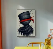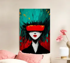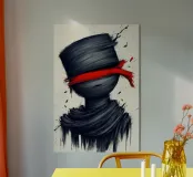 Una figura scura e apparentemente priva di contorni sembra dissolversi, mentre una banda rossa brillante ne copre gli occhi. La texture ruvida, quasi abbozzata, conferisce all'immagine una dinamica inquieta, come se stesse per dissolversi nello sfondo. Il netto contrasto tra nero, bianco e rosso crea un'atmosfera di isolamento, di ignoranza o di deliberata rinuncia alla percezione. Un simbolo della cecità, del tumulto interiore e del perdersi nella propria mente.