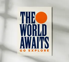 "Il mondo è tuo!" - Un avventuroso motivo estivo nelle vivaci tonalità del rosa, del rosso e dell'arancione. Questo disegno tipografico ispira viaggi ed esplorazioni, mentre il carattere audace incarna libertà e possibilità.