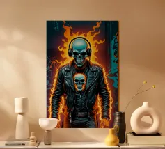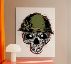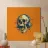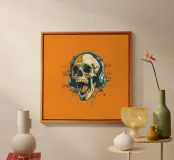 Illustrazione digitale dettagliata di un teschio umano che indossa grandi cuffie, su uno sfondo arancione vivo con effetti splatter. Il teschio sembra apprezzare la musica, aggiungendo un'atmosfera moderna e tagliente al design.