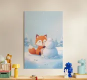 Con un sorriso giocoso, Voxy modella una piccola scultura di neve in una foresta innevata. Il blu tenue, la delicata nevicata e la simpatica energia invernale ne fanno un'illustrazione perfetta per i bambini e gli amanti delle vacanze.