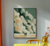 This expressive painterly artwork depicts two solitary figures moving forward beneath an immense, turbulent sky. Thick, dynamic brushstrokes and a restrained palette of sage green, sand, and muted ivory create a powerful sense of scale and inevitability. The composition explores themes of resilience, human fragility, and quiet determination, blending contemporary abstract expression with cinematic atmosphere and emotional depth.