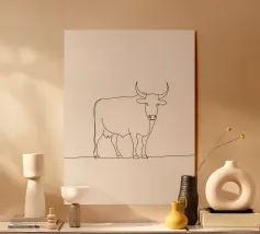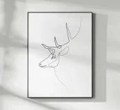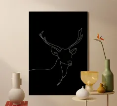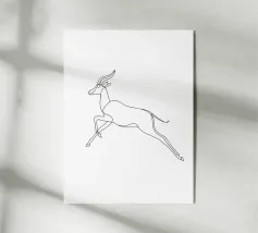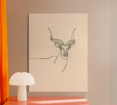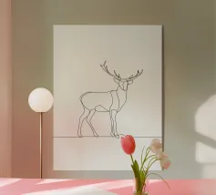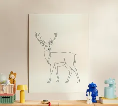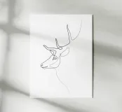 Illustrazione minimalista di un cervo, catturato in una forma fluida e astratta. Questa graziosa composizione evoca forza e serenità e si adatta perfettamente a interni tranquilli e contemporanei. Un tranquillo omaggio alla natura e all'eleganza.