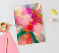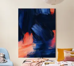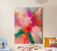 Quest'opera d'arte astratta presenta calde tonalità di rosa, corallo, arancio e giallo mescolate a tocchi di verde e blu. Le pennellate decise creano un senso di movimento e profondità, mentre lo sfondo morbido mantiene la composizione equilibrata e piacevole. Un pezzo moderno che porta calore, colore ed energia positiva negli spazi contemporanei.