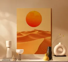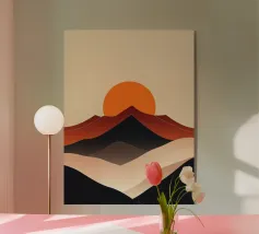 Un paesaggio desertico astratto con sabbia in primo piano e montagne rosse e gialle sullo sfondo. Sensazione di Giappone minimalista