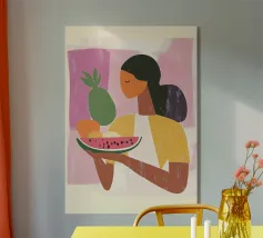 Un'elegante illustrazione di una donna in bikini rosso e occhiali da sole, che regge con sicurezza una grande fetta di anguria. Questa opera d'arte è l'epitome dell'estate chic, che cattura un momento di fresco e fruttato refrigerio.