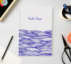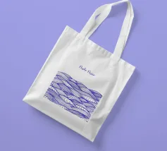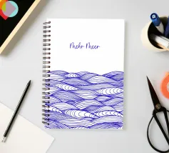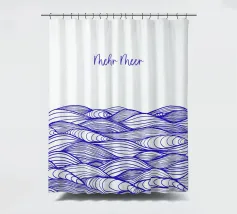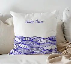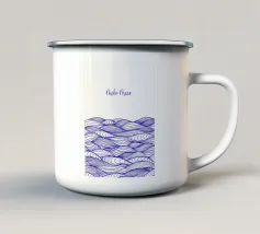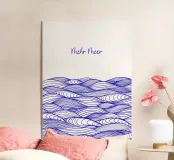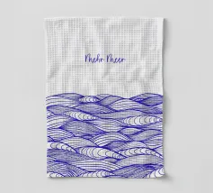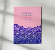 Disegno di onde blu del mare. Sopra di esso la scritta Mehr Meer (Più mare).