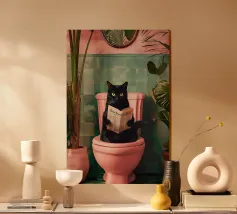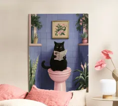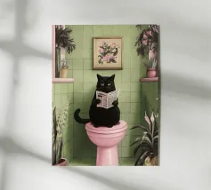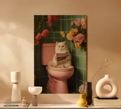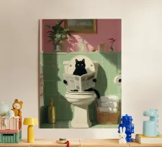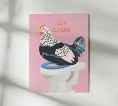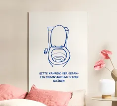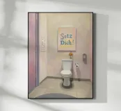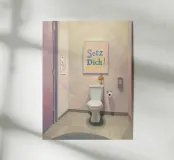 Un poster umoristico per il bagno in tenui colori pastello con l'allegro testo "Sit down" invita a sorridere nella toilette degli ospiti. Con una grafica minimalista, carta igienica ed elementi disegnati a mano, crea un'atmosfera divertente e invia un chiaro messaggio contro l'alzarsi per fare pipì!