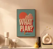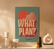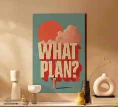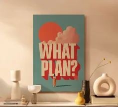 Una giocosa ribellione contro i rigidi programmi, "What Plan?" invita ad abbracciare la spontaneità e a lasciar perdere il perfezionismo. Con un'audace tipografia retrò che proietta lunghe ombre su un cielo surreale illuminato dal sole, quest'opera d'arte cattura il fascino eccentrico del fare le cose a modo proprio. Un'opera perfetta per le menti creative e gli spiriti liberi.