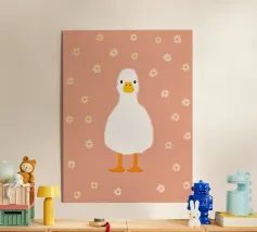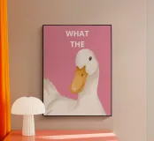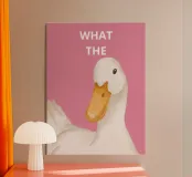 Un'anatra stravagante dall'espressione curiosa è centrata su uno sfondo rosa. Sopra l'anatra, un testo bianco in grassetto recita "WHAT THE".