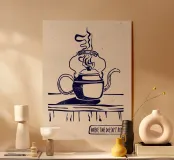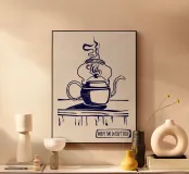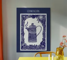 Stampa artistica minimalista in stile linoleografico di un bollitore fumante con la frase "Where Time Doesn't Rush". Un'illustrazione calda e di ispirazione vintage, perfetta per gli amanti del caffè, del tè e della vita lenta. Questa stampa da parete monocromatica conferisce un fascino accogliente e rustico a cucine, caffè e angoli di lettura, rendendola un regalo prezioso per coloro che amano le mattine tranquille.