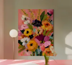 Una composizione vivace, ricca di petali magenta, gialli e corallo. Gioiosa, moderna e piena di carattere: un'attrazione immediata per gli interni più audaci.