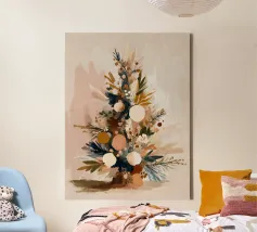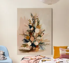 Stampa botanica natalizia neutra con rami di pino e ornamenti dorati. Perfetta per lo stile boho e scandi delle feste.