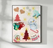 Un'illustrazione giocosa e natalizia in stile acquerello con deliziosi motivi come un pupazzo di neve, pattini da ghiaccio, tazze di cioccolata calda, bastoncini di zucchero, cuori di pan di zenzero e abeti. Scintille di stelle dorate e fiocchi di neve sono sparsi liberamente sullo sfondo chiaro, conferendo alla scena una calda e accogliente atmosfera invernale e natalizia.