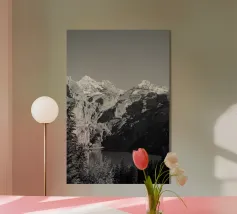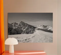 Una tranquilla fotografia in bianco e nero che cattura la luce del sole che attraversa una fitta foresta, proiettando lunghe ombre su una collina incontaminata e innevata. Un'aggiunta minimalista e senza tempo alla vostra parete.